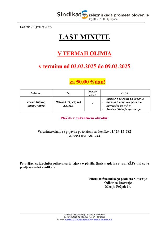 Odbor za letovanje Sindikata železniškega prometa Slovenije objavlja prosti termin (“last minute”) v Termah Olimia, in sicer od 2. do 9. februarja 2025: