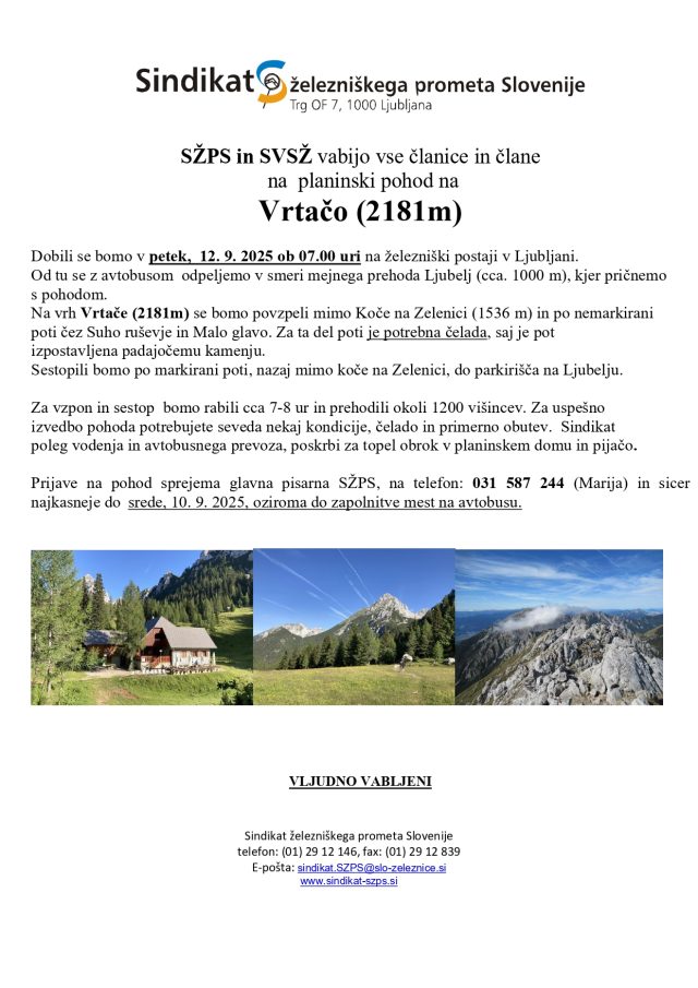 V petek, 12. septembra 2025 se bo z zborom ob 7.uri na Železniški postaji Ljubljana začel pohodniško-planinski dan za vse, ki vas ta oblika druženja in gibanja veseli.
