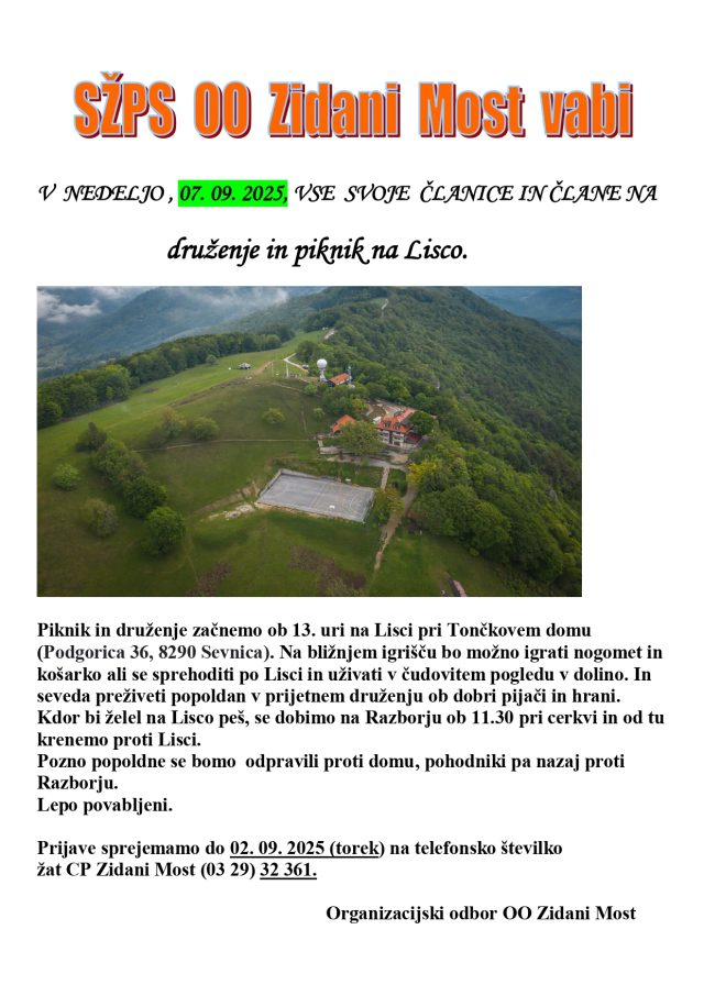 SŽPS OO Zidani Most vabi v nedeljo, 7. septembra 2025 na druženje in piknik na Lisco, ki bo od 13. ure dalje. Dogodek je tudi priložnost za nedeljsko krajše rekreiranje, saj je za zainteresirane predviden kratek pohod od Razborja (zbor ob 11.30) do Lisce. Prijave so možne do 2. septembra. Več v vabilu spodaj.