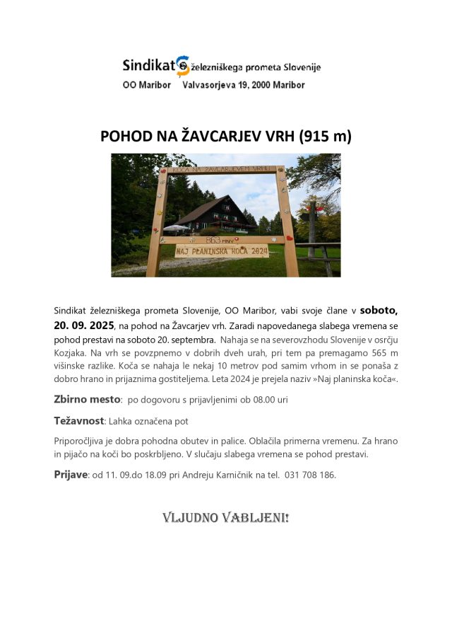 Zaradi napovedanega manj ugodnega vremena za pohodništvo v preteklem koncu tedna, je SŽPS OO Maribor sprejel odločitev, da pohod na Žavcarjev vrh izvedejo prihodnjo soboto, torej, 20. septembra. Zaradi zamika je tako podaljšan tudi čas za prijave, vse do 18. septembra 2025 lahko zainteresirani potrdijo udeležbo predstavniku organizatorja Andreju Karničniku.