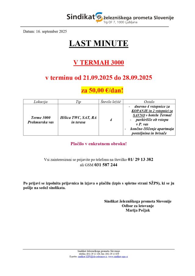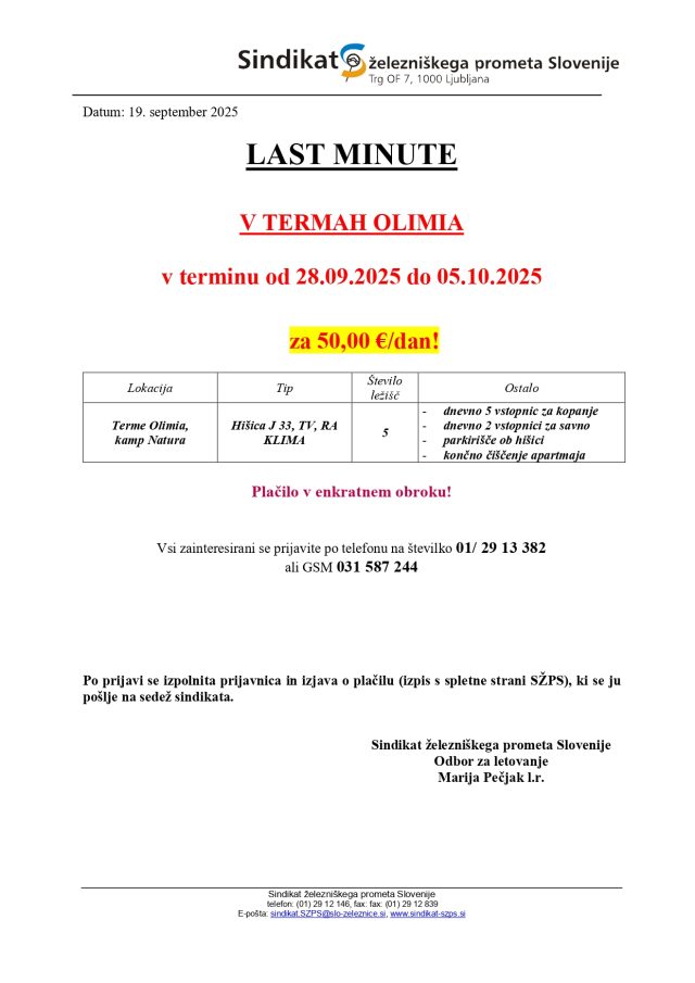 Odbor za letovanje Sindikata železniškega prometa Slovenije objavlja prosta termina (“last minute”) v Termah 3000, in sicer od 21. do 28. septembra 2025 in v Termah Olimia od 28. septembra do 5. oktobra 2025:
