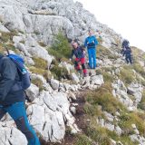 Sledil je sestop, po poti, ki jo je skupina z željo po malce lažji turi, že poznala, saj so jo ubirali navkreber. Po melišču navzdol je bilo potrebno polagati posebej previdno nogo pred nogo, saj je drselo in pod nogami so se valili kamni, nam znane oblike in velikosti -celo tako znane, da smo se hecali: “Le kdo je imel voljo toliko tolčenca znositi v te hribe? “