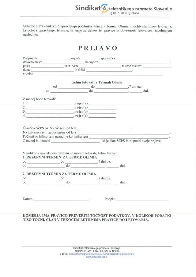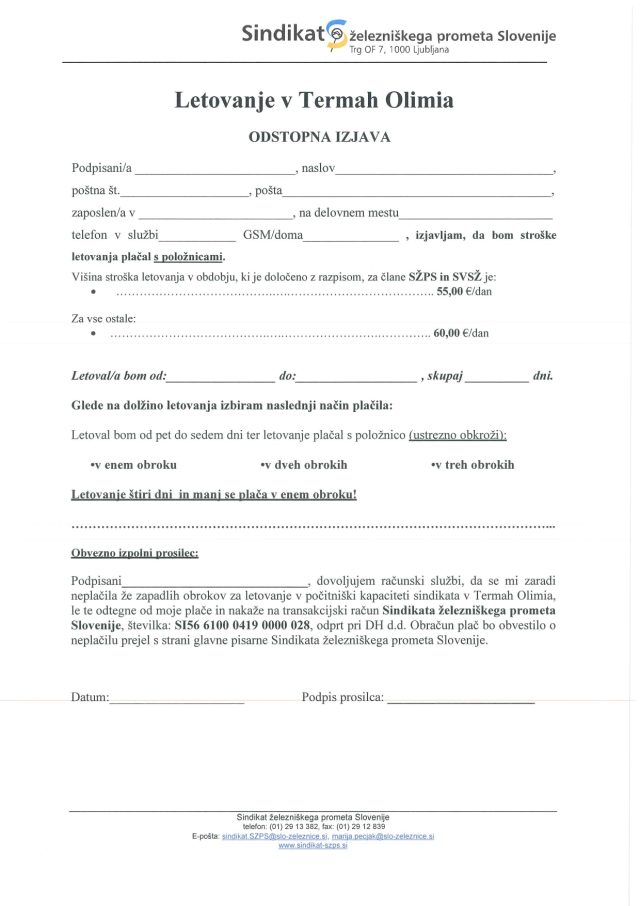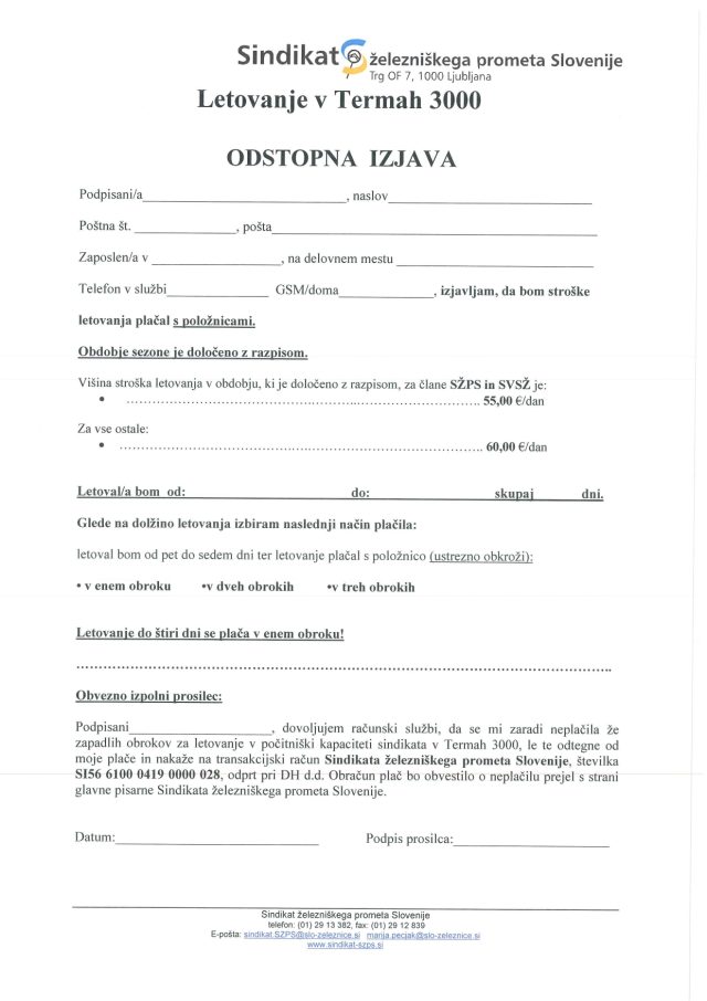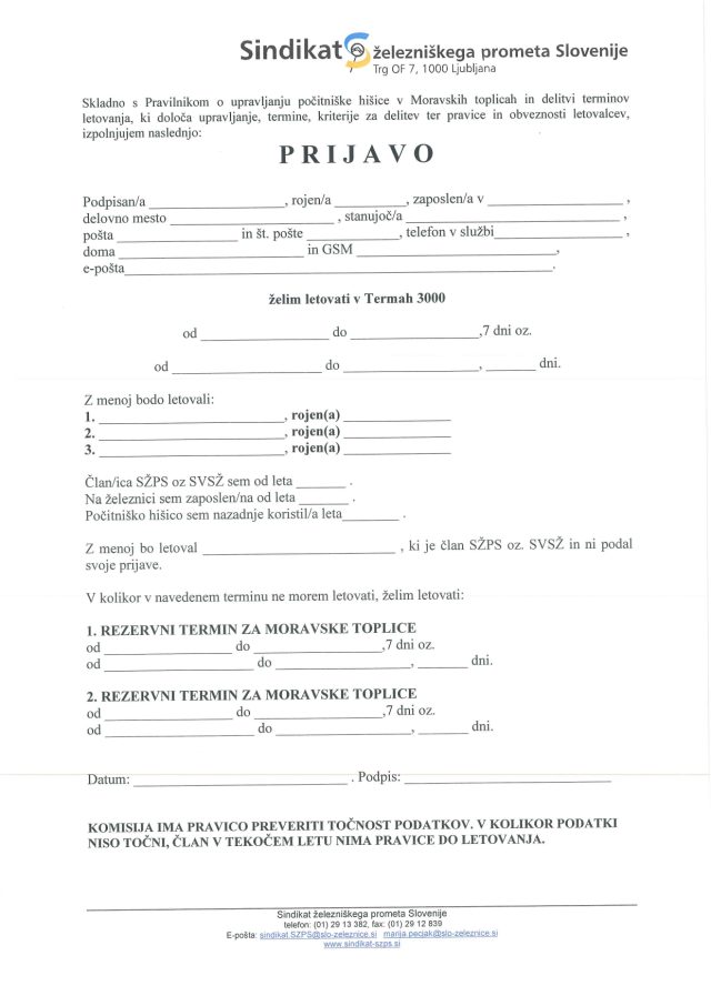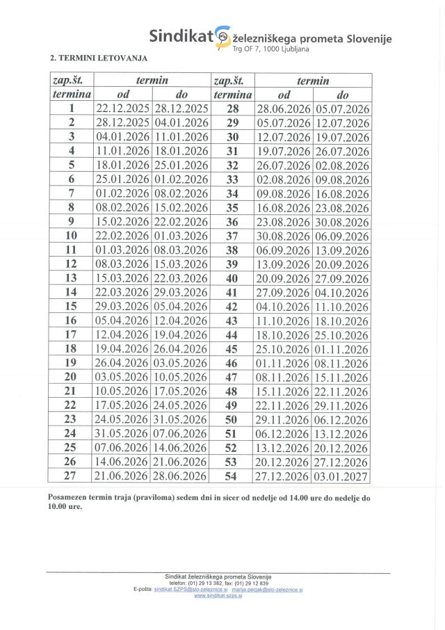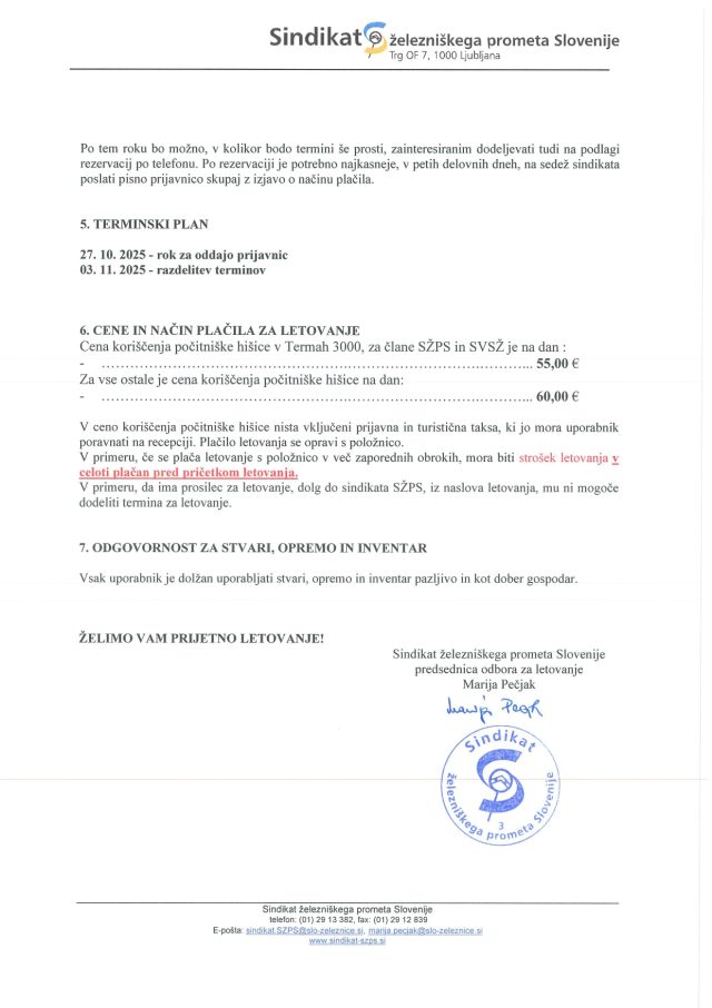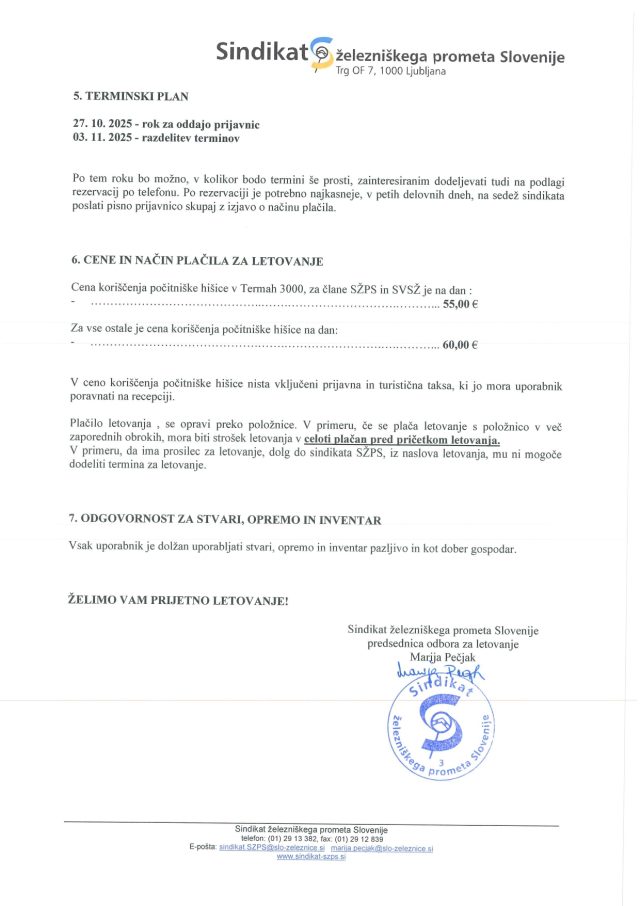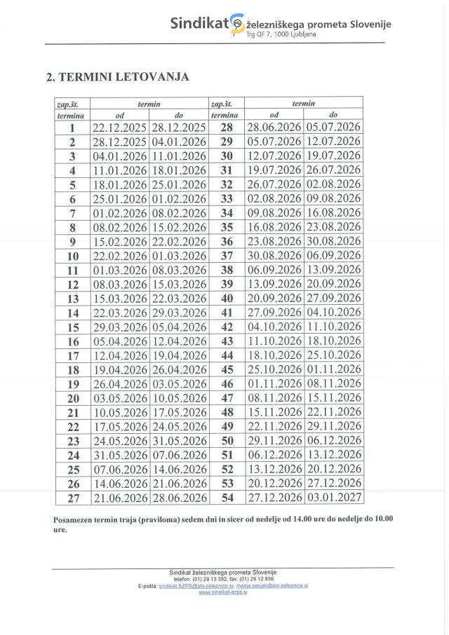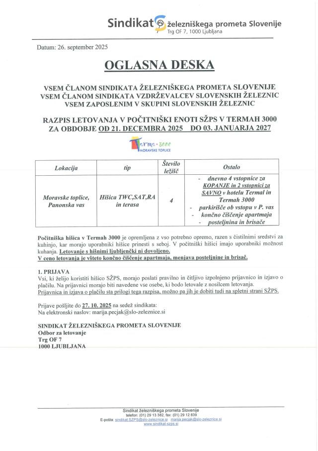 Vse člane Sindikata železniškega prometa Slovenije, vse člane Sindikata vzdrževalcev Slovenskih železnic ter vse zaposlene v skupini Slovenskih železnic obveščamo, da je objavljen razpis letovanja za prihodnje leto, z razpoložljivimi datumi od 21. decembra letos do 3. januarja 2027. Prijave se bodo zbirale do 27. oktobra 2025. Vabljeni k ugodnemu koriščenju sindikalnih počitniških kapacitet.