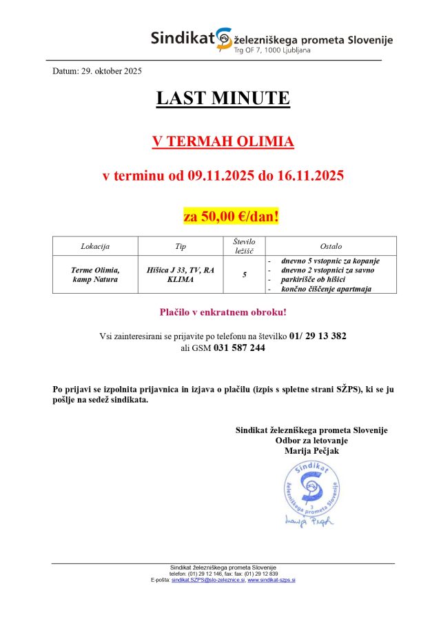 Odbor za letovanje Sindikata železniškega prometa Slovenije objavlja prost termin (“last minute”) v Termah Olimia, in sicer od 9. do 16. novembra 2025 :