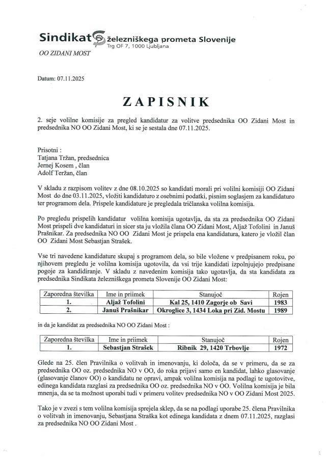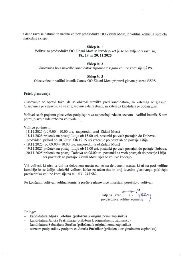 V prilogi vam v vednost pošiljamo zapisnik volilne komisije