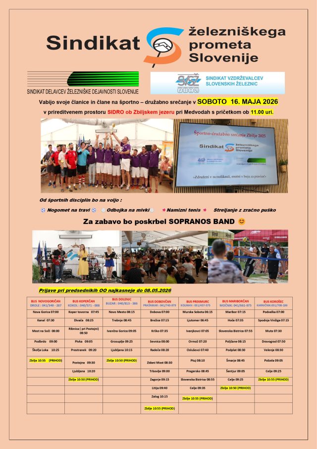 Spoštovani člani in članice Sindikata železniškega prometa Slovenije, vljudno vabljeni k udeležbi na vsakoletnem športno-družabnem srečanju, ki bo tudi letos potekal na prireditvenem prostoru Sidro ob Zbiljskem jezeru pri Medvodah, in sicer v soboto, 16. maja 2026. Prijave sprejemajo predsedniki območnih organizacij.