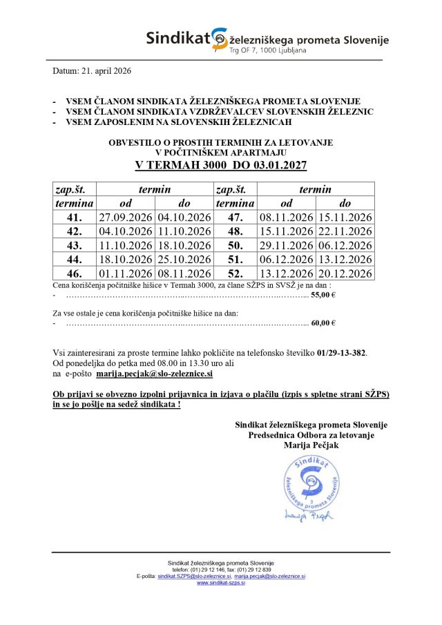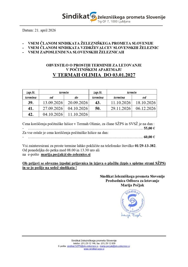 Odbor za letovanje Sindikata železniškega prometa Slovenije objavlja proste termine v Termah 3000 in Termah Olimia na dan 21. april 2026 – vabljeni k prijavi!